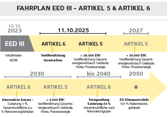 Die Energieeffizienzrichtlinie (EED III) legt Verpflichtungen und Einsparziele im öffentlichen Sektor fest. Im Mittelpunkt stehen die Artikel 5 – „Vorbildfunktion & Energieeinsparung für öffentliche Einrichtungen” sowie Artikel 6 – „Inventar & Sanierungsstrategie für öffentliche Gebäude”. Gemeinsam sind sie eine Kombination aus Verbrauchsreduktion und strukturierter Sanierungsplanung.